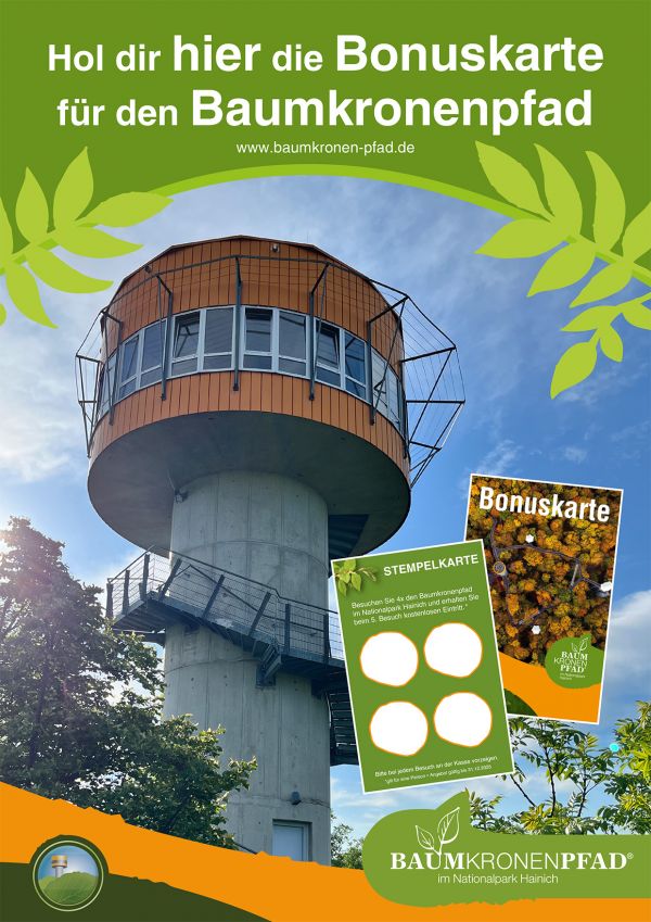 Wir freuen uns, Ihnen unsere neue Bonuskarte vorzustellen. Ab sofort haben Sie die Möglichkeit, vier Stempel auf Ihrer Karte zu sammeln und beim fünften Besuch kostenlosen Eintritt zu erhalten. Die Bonuskarte ist bis zum 31. Dezember 2025 gültig und bietet eine großartige Gelegenheit, die faszinierende Natur des Hainich zu erkunden.